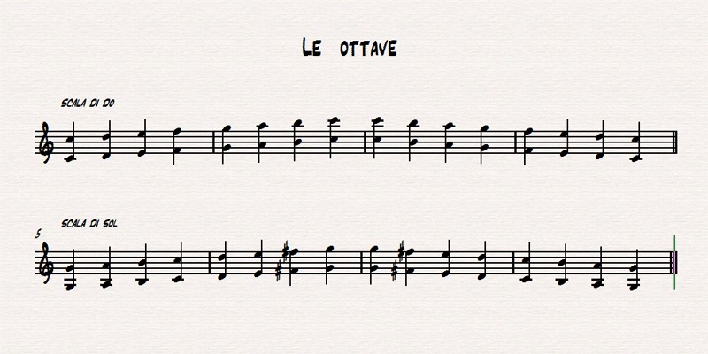 Nella figura successiva è illustata la sequenza di ottave che suoneremo sulla fisarmonica diatonica, più precisamente una scala di ottave di DO (ascendente e discendente) e una di SOL (ascendente e discendente). Si può ascoltare l'intera sequenza mediante il player sottostante.