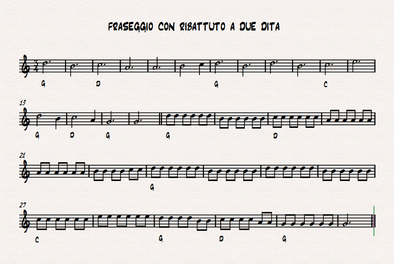 Il fraseggio che studieremo con il ribattutto a due dita è una semplice frase di valzer (tempo 3/4) che si può leggere nella partitura nella figura.