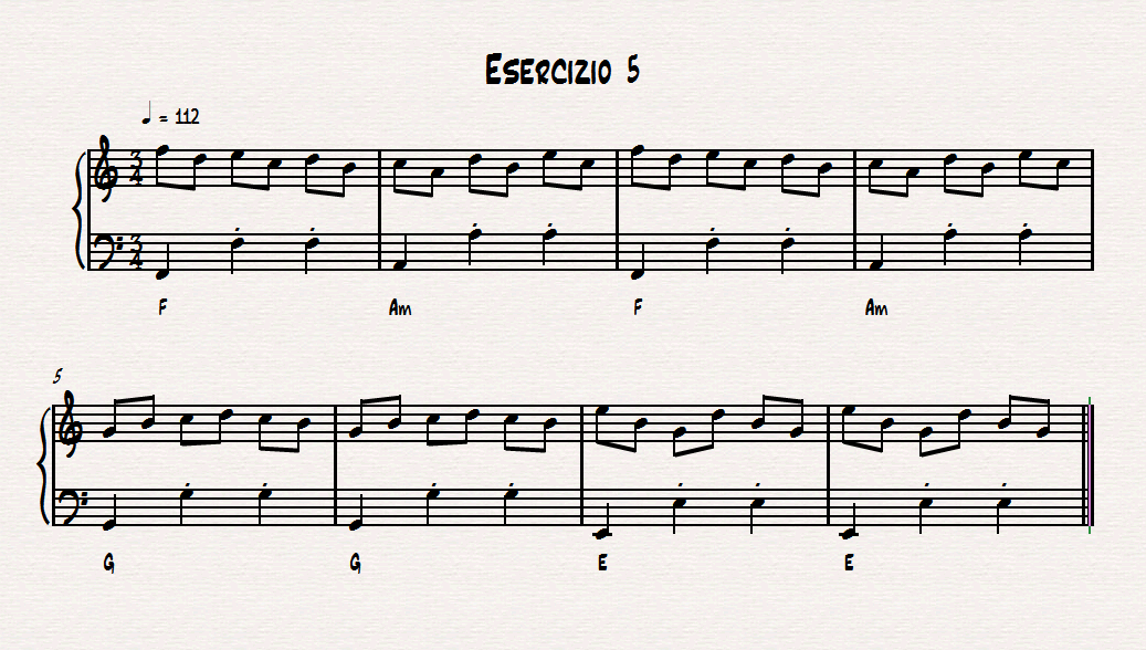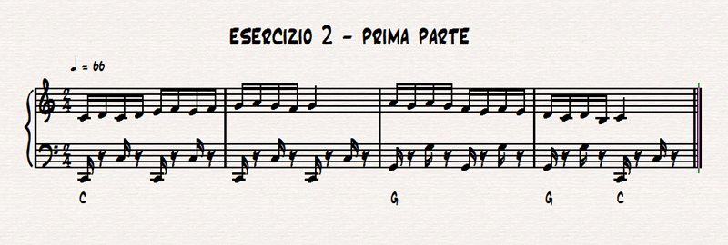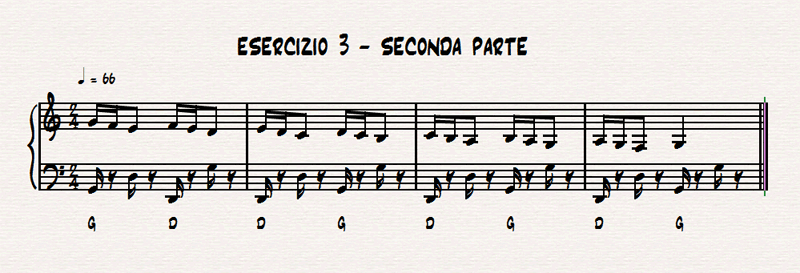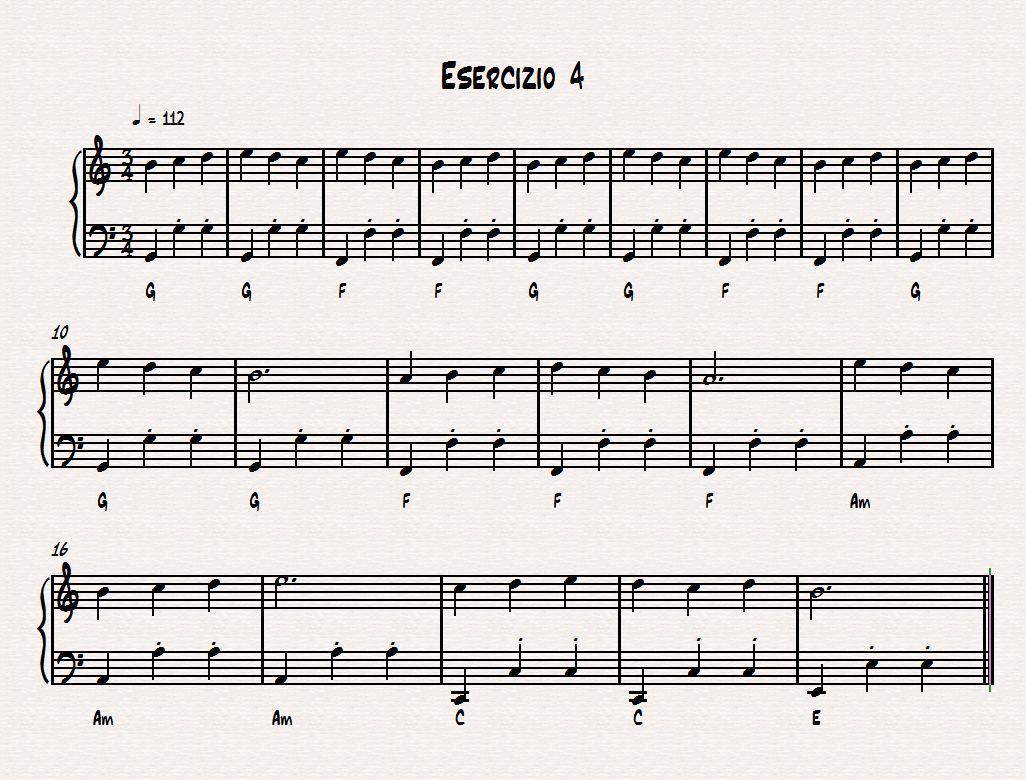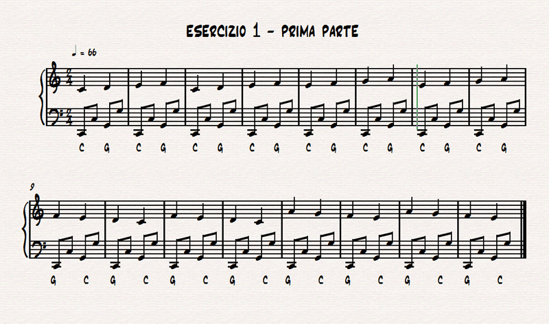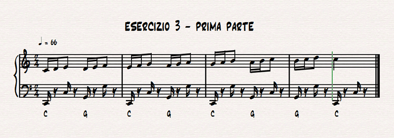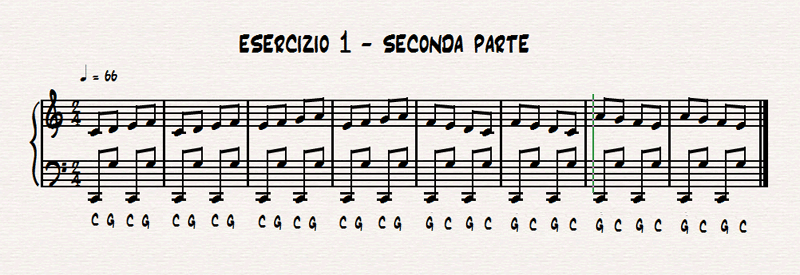 Importante. Eseguiamo l'esercizio dapprima senza l'accompagnamento come indicato nel video. Quando saremo sicuri con la mano destra, potremo aggiungere l'accompagnamento dei bassi.