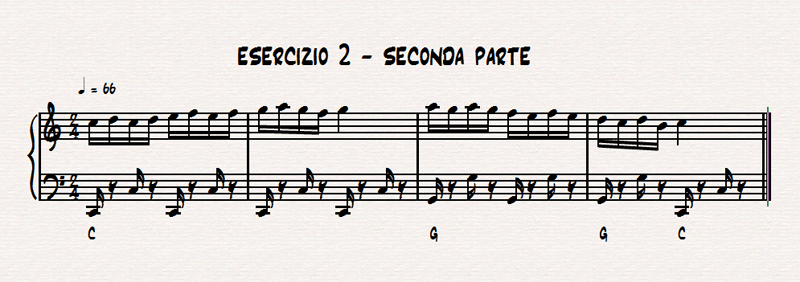 Vediamo qui di seguito, la partitura della seconda parte dell'esercizio n. 1, contraddistinta da un ritmo più veloce in ottavi (crome).
