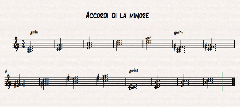 Vediamo quindi in sequenza tutti gli accordi precostituiti dell'organetto a otto bassi: LA minore, MI maggiore, FA maggiore, DO maggiore e SOL maggiore.