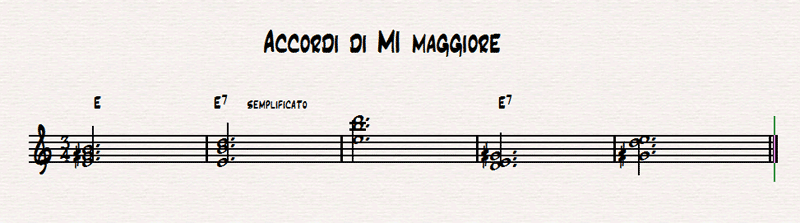 Nella figura successiva sono illustati i principali accordi della gamma del MI maggiore (gli accordi relativi a questa sezione della lezione) ottenibili sulla tastiera di un organetto otto bassi. Si può ascoltare l'intera sequenza mediante il player sottostante.
