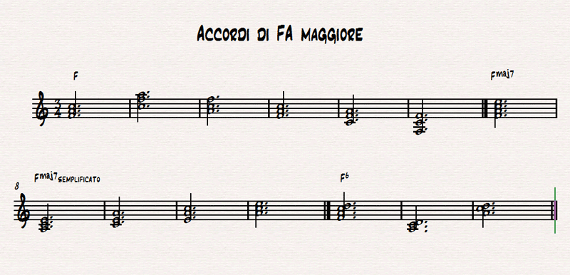 Nella figura successiva sono illustati i principali accordi della gamma del FA maggiore (gli accordi relativi a questa sezione della lezione) ottenibili sulla tastiera di un organetto otto bassi. Si può ascoltare l'intera sequenza mediante il player sottostante.