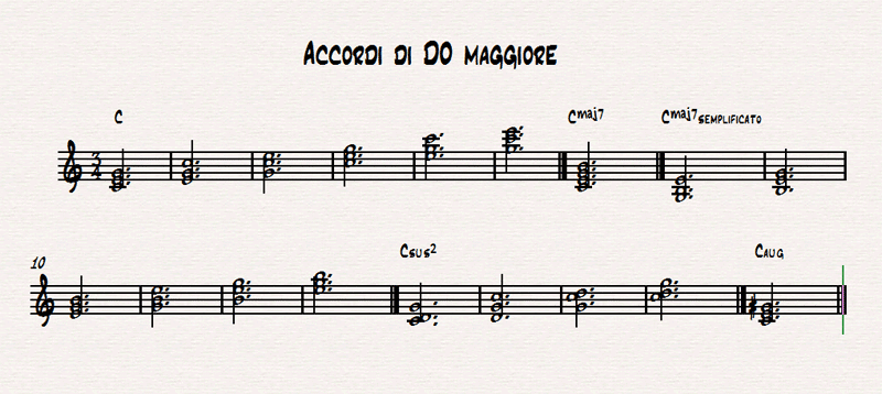 Nella figura successiva sono illustati i principali accordi della gamma del DO maggiore (gli accordi relativi a questa sezione della lezione) ottenibili sulla tastiera di un organetto otto bassi. Si può ascoltare l'intera sequenza mediante il player sottostante.
