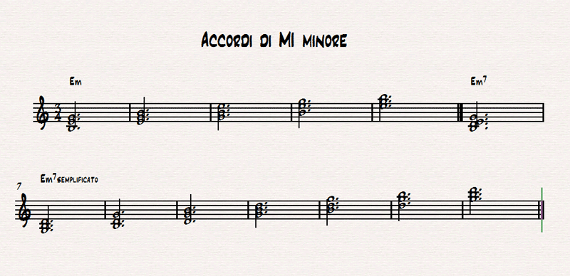 Nella figura successiva sono illustati i principali accordi della gamma del MI minore (gli accordi relativi a questa sezione della lezione) ottenibili sulla tastiera di un organetto otto bassi. Si può ascoltare l'intera sequenza mediante il player sottostante.