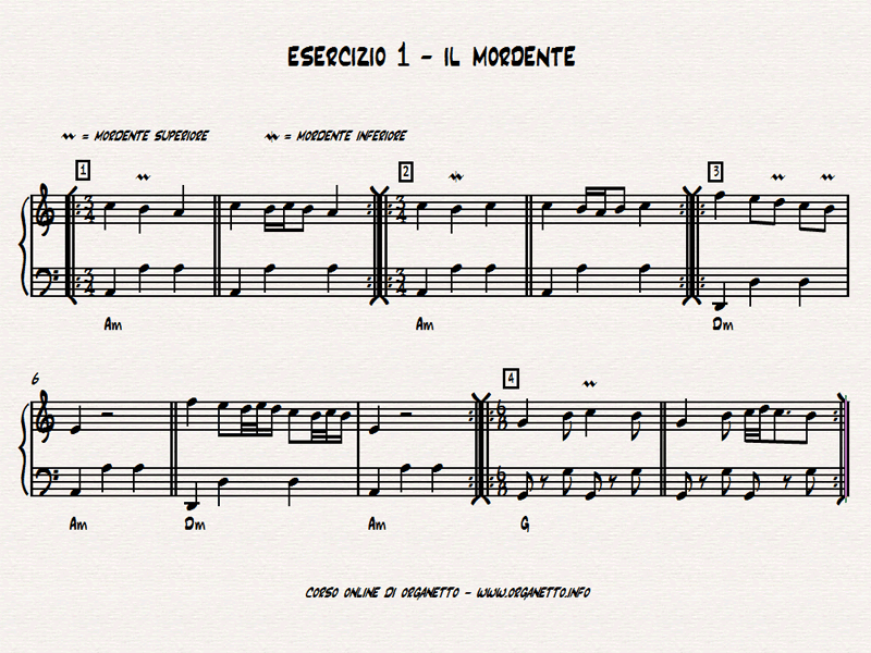 Serie di due mordenti superiori su ottavi in tempo di 3/4.