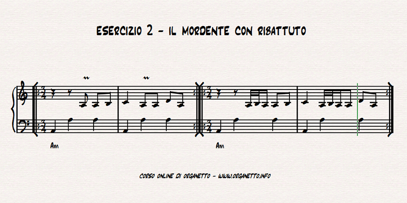Il mordente con ribattuto si ha quando la nota abbellita col mordente è seguida dalla stessa nota.