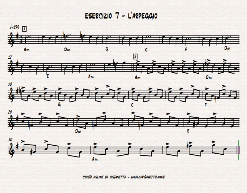Suddivideremo quindi l'esercizio in quattro parti suonando i quattro gruppetti. Vediamo qui di seguito la partitura dell'esercizio n. 7.