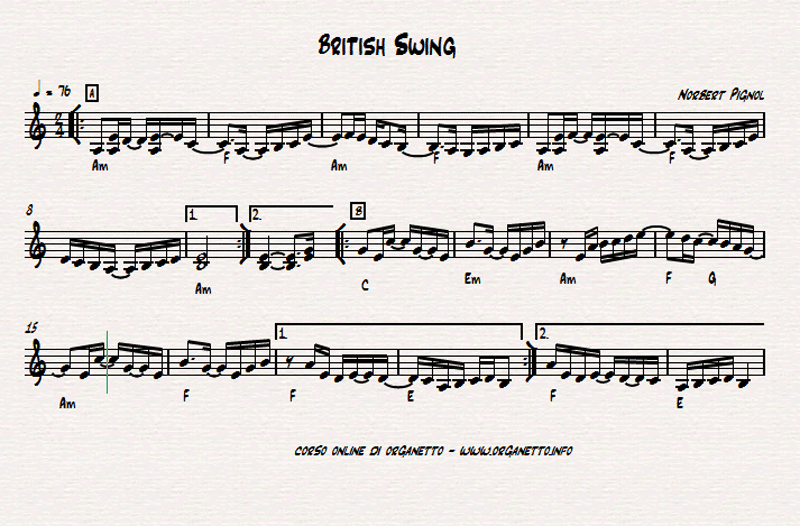 La melodia di British swing è caratterizzata da una melodia sempre sincopata rispetto al ritmo fondamentale in 4 tempi ed è questa la maggiore difficoltà del brano. Quindi sarà questa la caratteristica principale della nostra interpretazione.