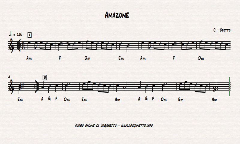 Il brano è formato da due frasi, che chiameremo frase A e frase B (come evidenziato anche nella partitura che segue). La versione di "Amazone" che studieremo fa riferimento a questa partitura, una trascrizione fedele delle note suonate dal compositore francese. Non la useremo a fini didattici, ma sarà utile a chi sa leggere la musica.