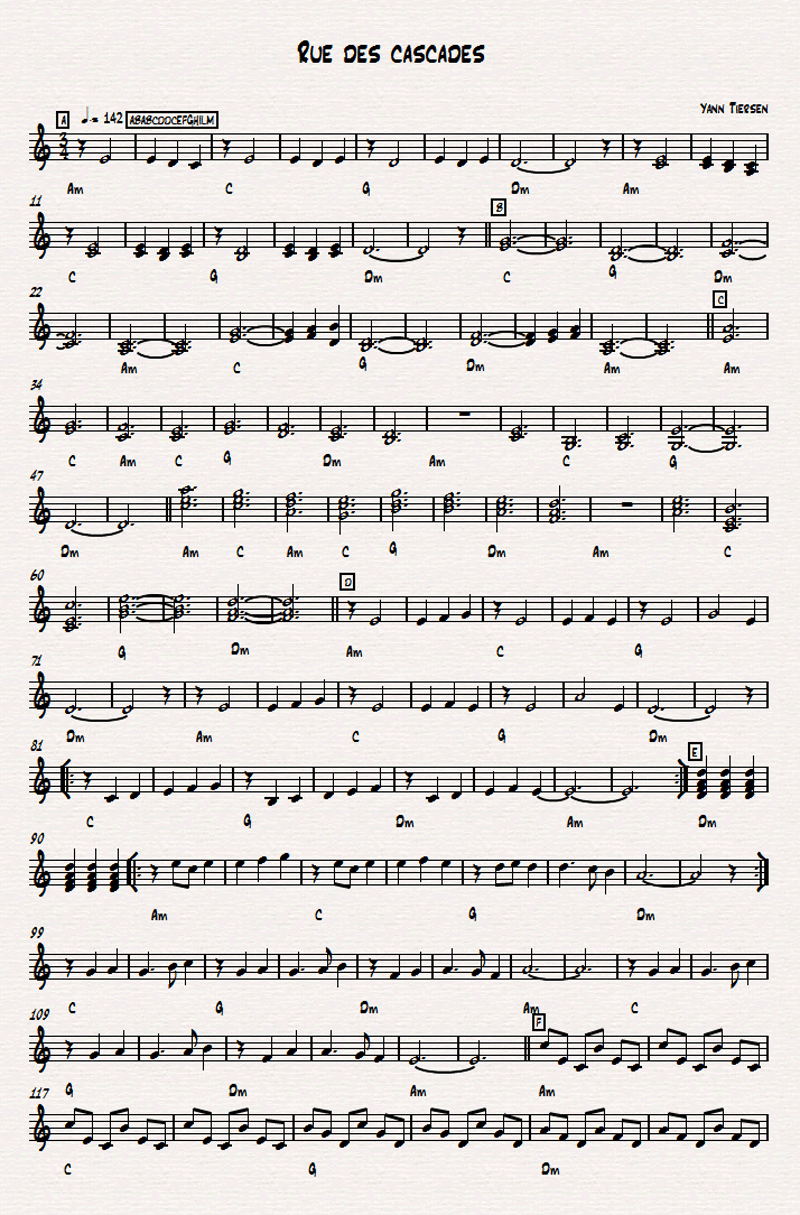 Il brano di Tiersen è scritto in 3 tempi. I tre tempi vengono suddivisi secondo la classica scansione che segue: