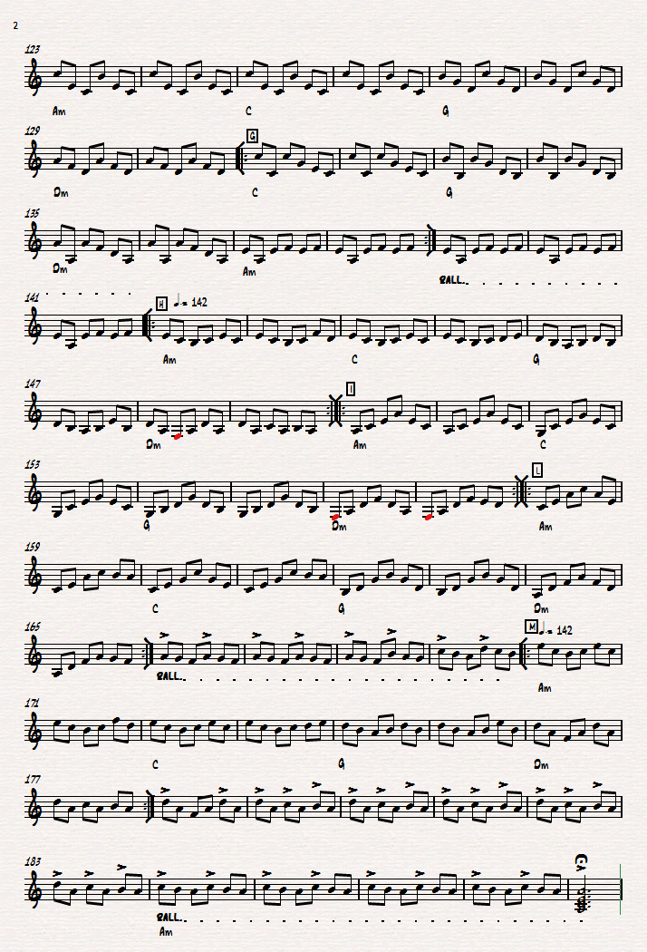 Ecco qui di seguito la partitura completa del brano (due pagine), una trascrizione di Gianni Ventola Danese mediata dalla versione originale. Non la useremo a fini didattici, ma sarà molto utile a chi sa leggere la musica.