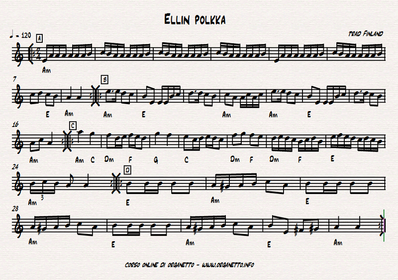 Ora che abbiamo terminato di studiare le frasi A, B, C e D possiamo suonare la nostra prima polka finlandese seguendo la sequenza AABBCCDD.