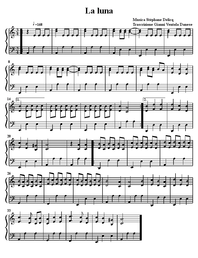 Il brano è formato da due frasi, che chiameremo frase A e frase B (come evidenziato anche nella partitura che segue). La versione di "La luna" che studieremo fa riferimento a questa partitura, una trascrizione del tema principale di questo valzer. Non la useremo a fini didattici, ma sarà utile a chi sa leggere la musica.