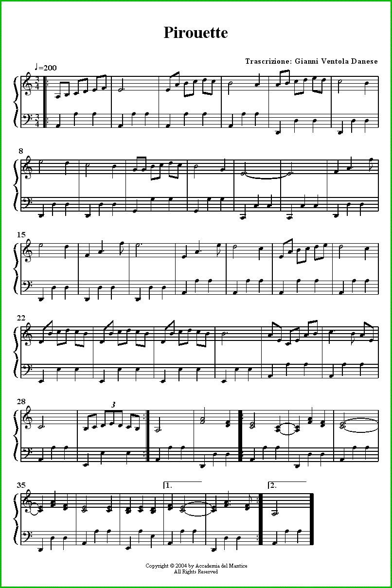 Il brano è formato da due frasi, che chiameremo frase A e frase B (come evidenziato anche nella partitura che segue). La versione di "Pirouette" che studieremo fa riferimento a questa partitura, una trascrizione fedele delle note suonate dal compositore francese. Non la useremo a fini didattici, ma sarà utile a chi sa leggere la musica.