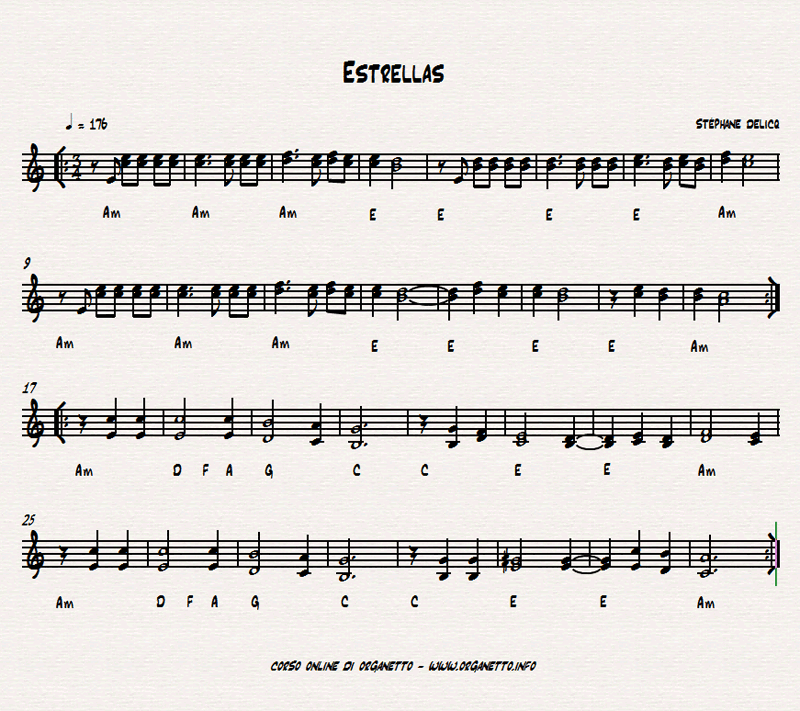Come accennato in precedenza, l'esecuzione de "Estrellas" richiede anche una particolare tecnica che vedremo illustrata nei prossimi video, ovvero quella di armonizzare il canto sempre per bicordi, cioé suonando sempre due note alla volta. Frequentemente si dovrà pertanto suonare col pollice mobile, ovvero non appoggiato allo strumento.