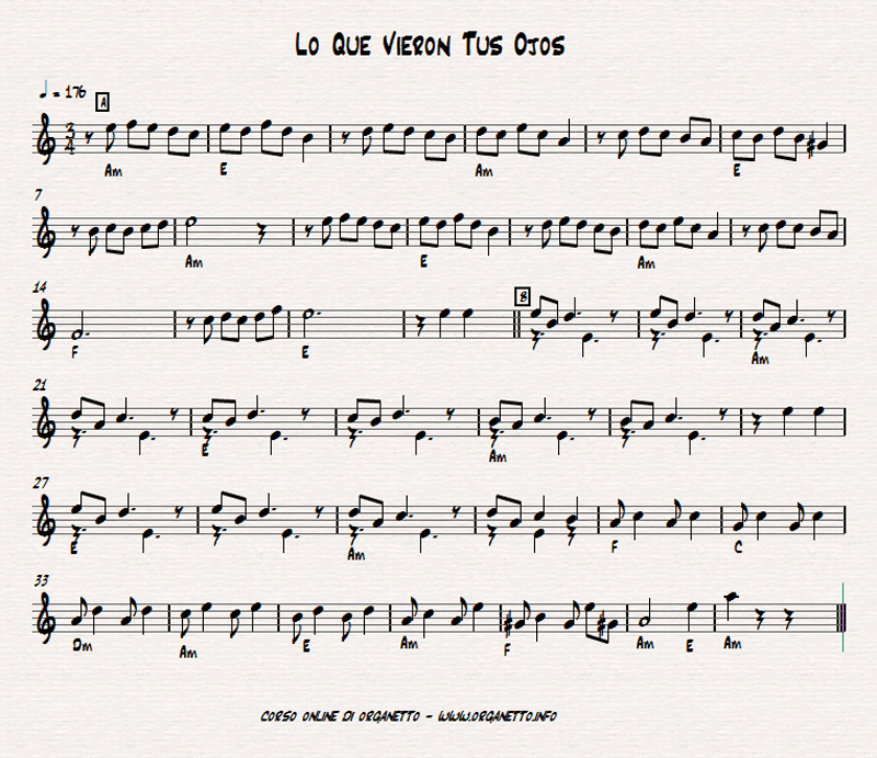 Il brano è formato da due frasi, che chiameremo frase A, e frase B (come evidenziato anche nella partitura che segue). La versione di "Lo que vieron tus ojos" che studieremo fa riferimento a questa partitura, una trascrizione del tema principale di questo valzer tango. Non la useremo a fini didattici, ma sarà utile a chi sa leggere la musica.