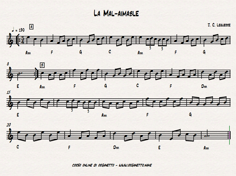 Il brano è formato da due frasi, che chiameremo frase A e frase B (come evidenziato anche nella partitura che segue). La versione di "La mal aimable" che studieremo fa riferimento a questa partitura, una trascrizione fedele delle note suonate dal compositore francese. Non la useremo a fini didattici, ma sarà utile a chi sa leggere la musica.