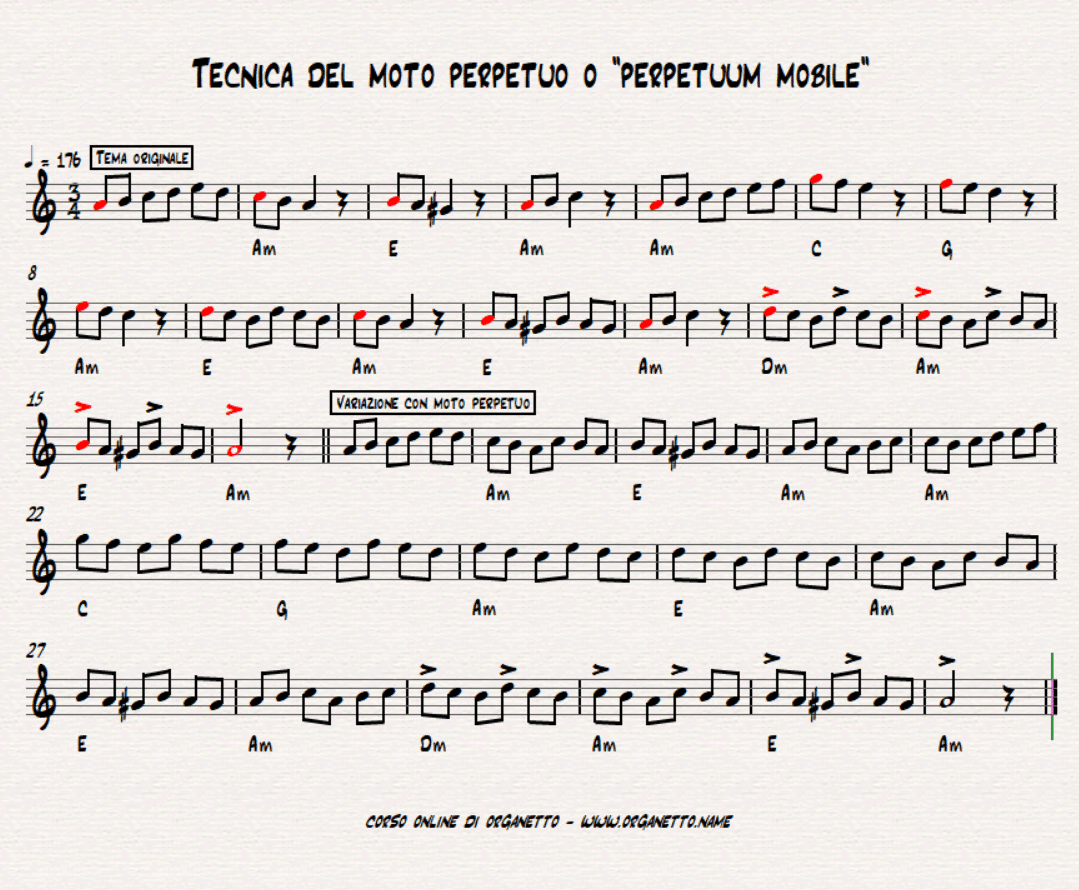 In musica, il moto perpetuo oppure "perpetuum mobile" identifica dei brani musicali, o parti di brani, caratterizzati da un flusso continuo di note, solitamente a un ritmo rapido. Possiamo quindi capire da soli che questa tecnica non si può utilizzare per variare una melodia già di per sé molto veloce, scritta per esempio in ottavi o sedicesimi. Il tema originale può essere parzialmente veloce, ma deve avere delle note di stasi, o delle pause, dove noi andremo a inserire nuove note che non appartengono al tema originale.